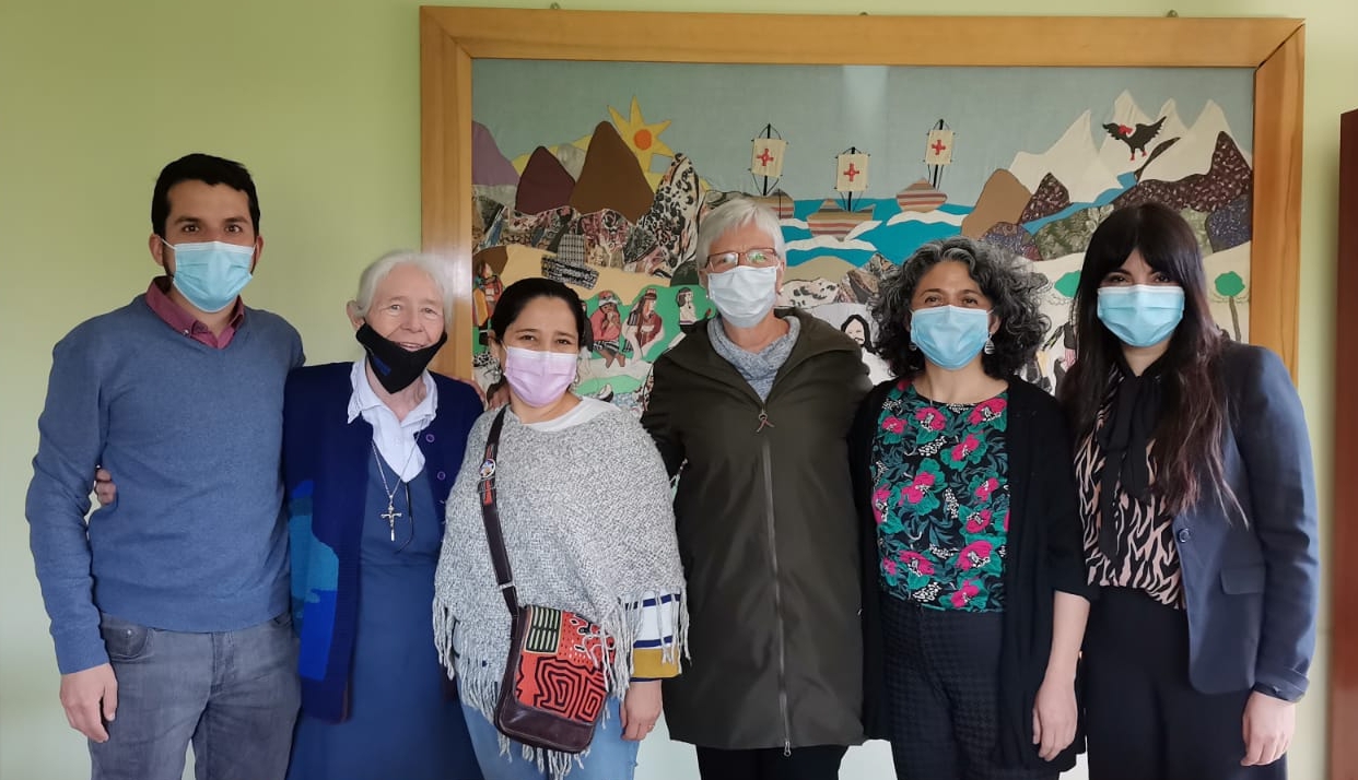 De izq a der: Director de Vinculación con el Medio, Diego Pinto; hermana Karoline Mayer; Vicerrectora académica, Paola Quintanilla; encargada de Oficina de Transversalidad, María Eugenia Letelier; coordinadora General de Prácticas, Graciela Muñoz; y directora de Docencia, Andrea Figueroa.[/caption]