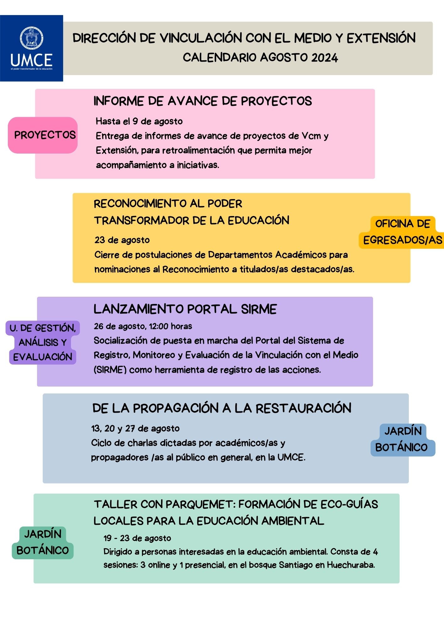 Compartimos a continuación calendario de la Dirección de Vinculación con el Medio y Extensión, correspondiente al mes de agosto.