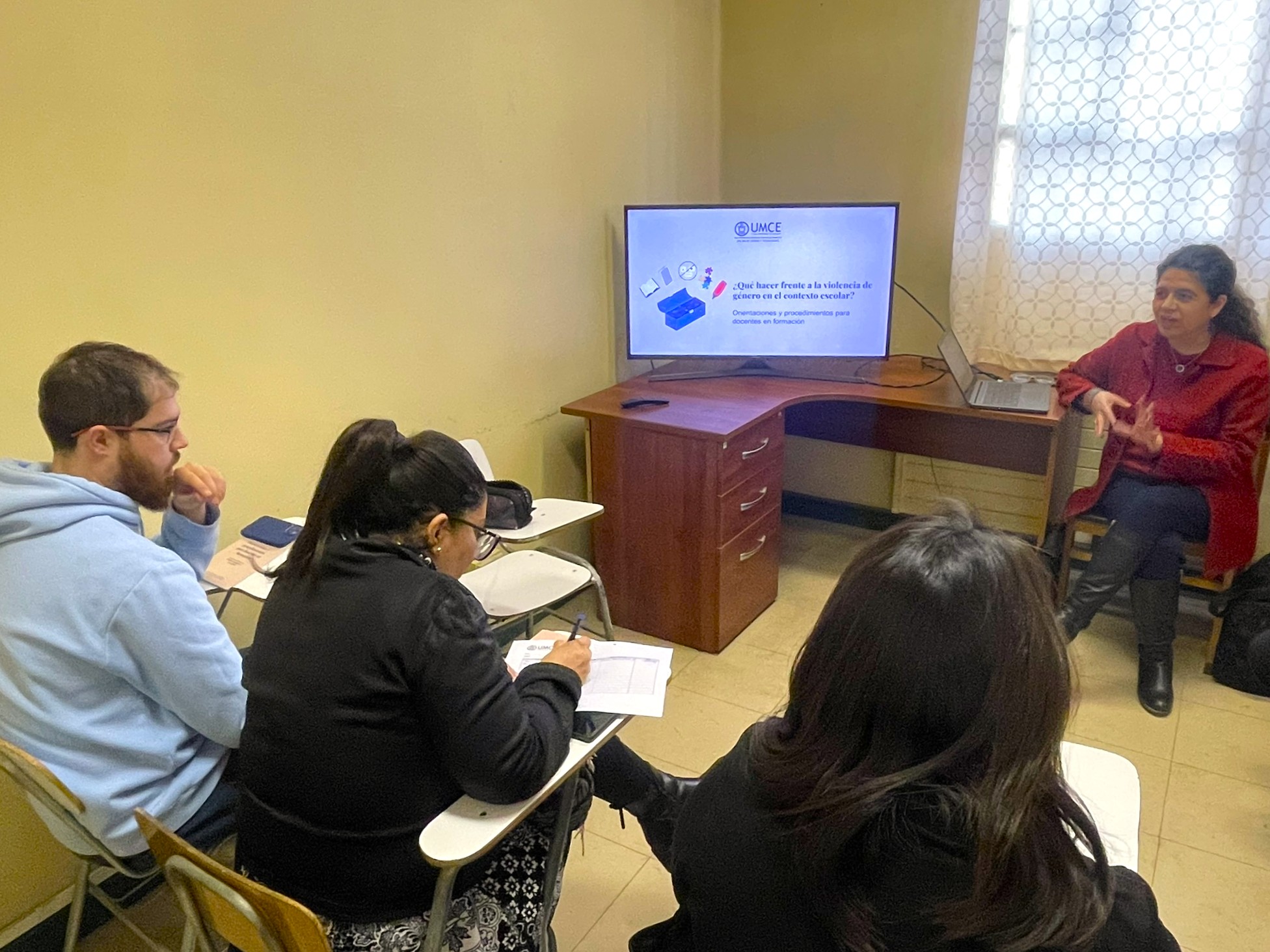 Entre ellas, destacaron la socialización del texto de Orientaciones y procedimientos para docentes en formación ¿Qué hacer frente a la violencia de género en la escuela? (disponible aquí), una herramienta que se realizó entre la Dirección de Prácticas UMCE y la OGS para fortalecer la formación de docentes a través de un marco de derechos humanos y género, para preparar a futuros profesores y profesoras para enfrentar situaciones complejas en contextos educativos, especialmente en cuanto a violencia de género. En este caso, estudiantes y docentes de los departamentos de Francés, Historia y Geografía, Educación Diferencial y Música, pudieron conocer este texto y las recomendaciones que contiene.