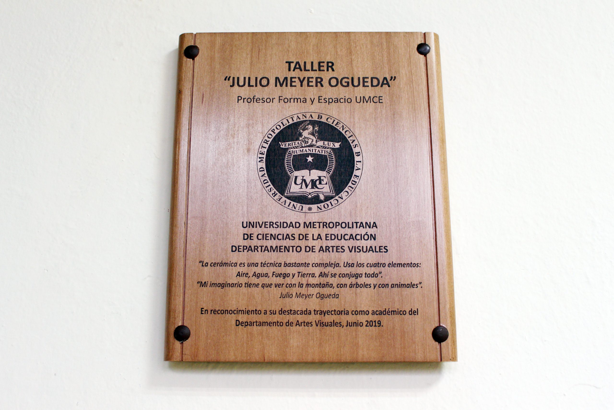 Tras un emotivo discurso de cinco estudiantes -Catalina Berríos, Catalina Fernández, Matías Ogaz, Gonzalo López y Bárbara Rojas-, vino la gran sorpresa y homenaje que el Departamento quiso brindar al saliente académico. En medio de abrazos y aplausos, bajó hasta su querido taller de cerámica, donde, para su sorpresa, develó la placa que mostraba cómo su nombre quedará plasmado para siempre en ese espacio, que fue bautizado en su honor.