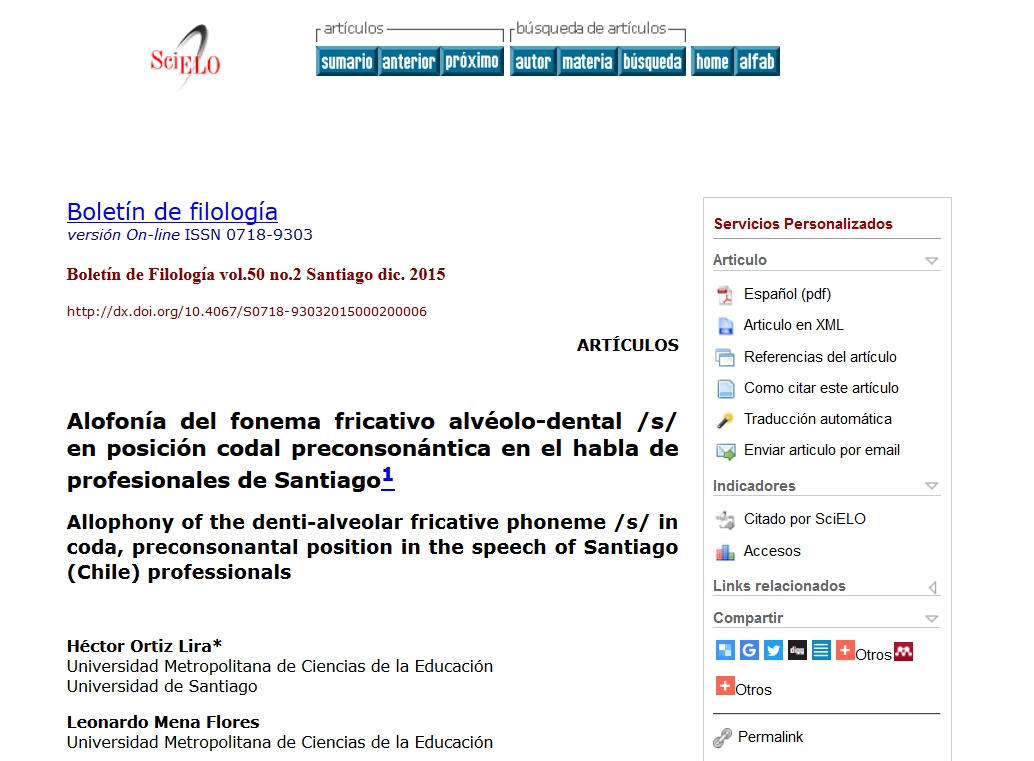 ‘Alofonía del fonema fricativo alvéolo-dental /s/ en posición codal preconsonántica en el habla de profesionales de Santiago’, es el nombre del artículo recientemente publicado por los académicos e investigadores del Departamento de Inglés de la UMCE, Héctor Ortiz y Leonardo Mena, en el Boletín de Filología del Departamento de Lingüística, de la Universidad de Chile.