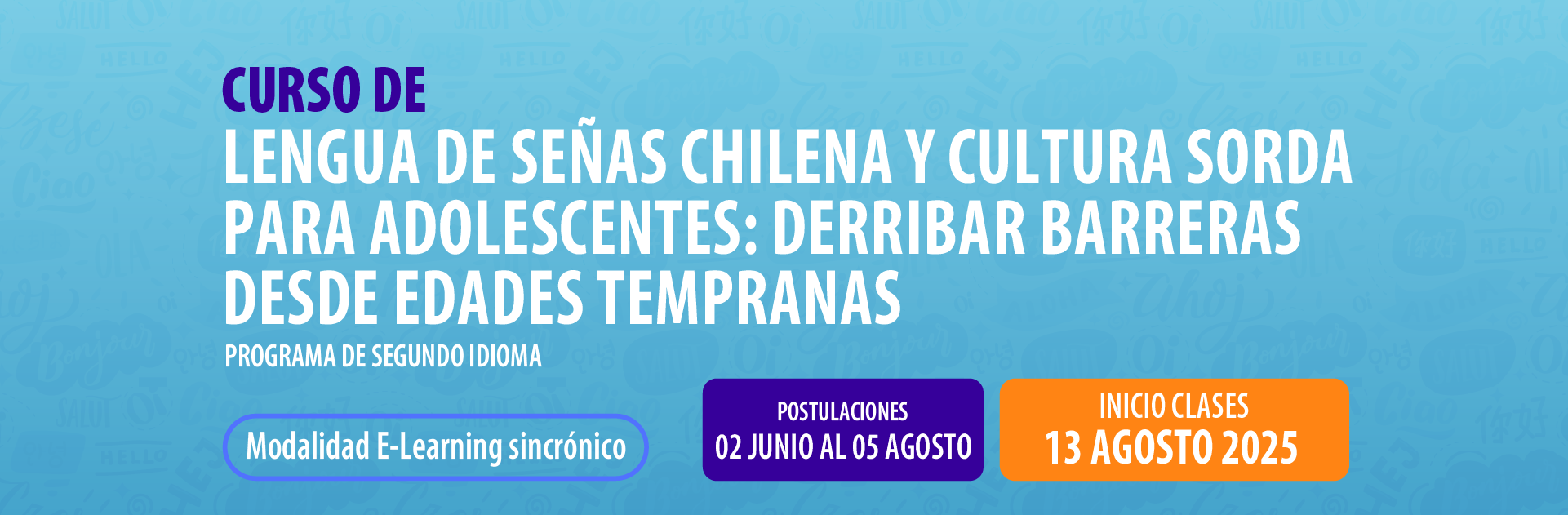 Este curso busca introducir a las/os adolescentes en el aprendizaje de la Lengua de Señas Chilena (LSCh) y en el conocimiento de la Cultura Sorda, promoviendo la inclusión social a través del manejo de la comunicación en LSCh desde edades tempranas. A través de un enfoque práctico y participativo, las/os participantes desarrollarán habilidades comunicativas de nivel inicial referidas a la producción y comprensión de este idioma. Además se espera desarrollar una comprensión sobre la importancia de la diversidad lingüística con énfasis en la interculturalidad y la minimización de las barreras del entorno.
