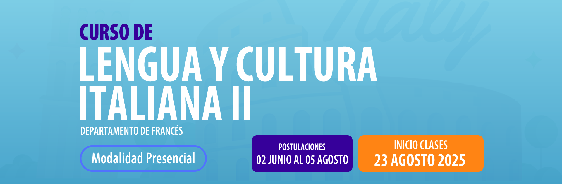 El curso de lengua y civilización italiana II será orientado a la capacidad de comprender y utilizar expresiones familiares de uso cotidiano y fórmulas muy comunes para satisfacer necesidades de tipo concreto. Sabe presentarse y presentar a otras personas y es capaz de hacer preguntas sobre datos personales y de responder preguntas análogas (el lugar donde vive, las personas que conoce, las cosas que posee). Logra comunicar en modo simple siempre que el interlocutor hable lentamente y muy claro y esté dispuesto a colaborar. Se reforzará el tiempo presente con gramática, léxico, pronunciación, lectura en voz alta, escritura. Se remota fórmulas y variantes para presentarse y presentar; hora y horario; modo de plantear preguntas; informaciones personales, gustos y preferencias; indicaciones y lo que se ve en el aeropuerto; viajes. Iniciación al tiempo pasado. Se desarrollarán las competencias orales y escritas: audición, expresión, integración.