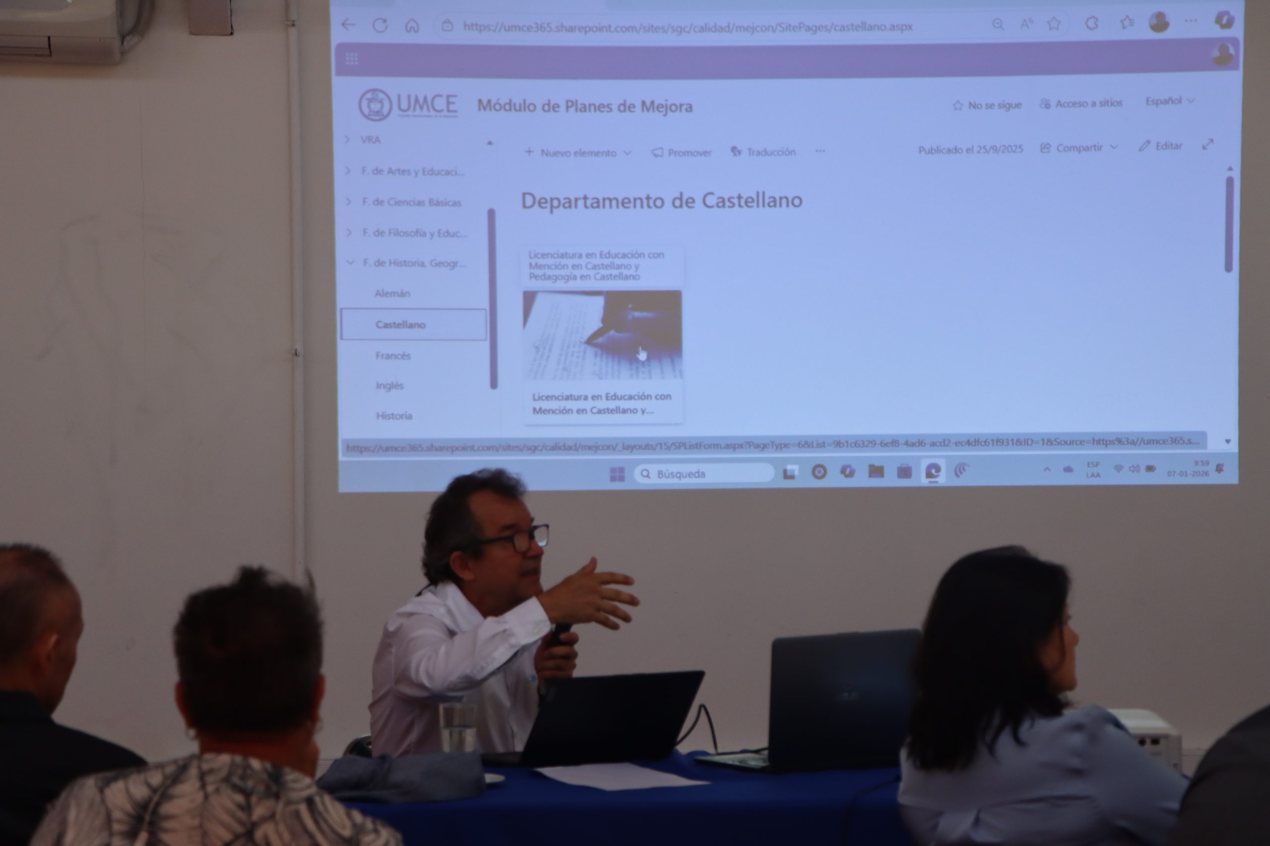 Además, se presentó el Sistema de Gestión Interna de la Calidad, con énfasis en el sistema de seguimiento de planes de mejora, herramienta que permite ordenar y monitorear compromisos derivados de evaluaciones internas y externas. En esta parte, se explicaron de manera explícita los pasos de registro, las responsabilidades de carga y el tipo de evidencias y medios de verificación que deben adjudicarse para respaldar debilidades identificadas en informes, asegurando trazabilidad y continuidad en las acciones de mejora.