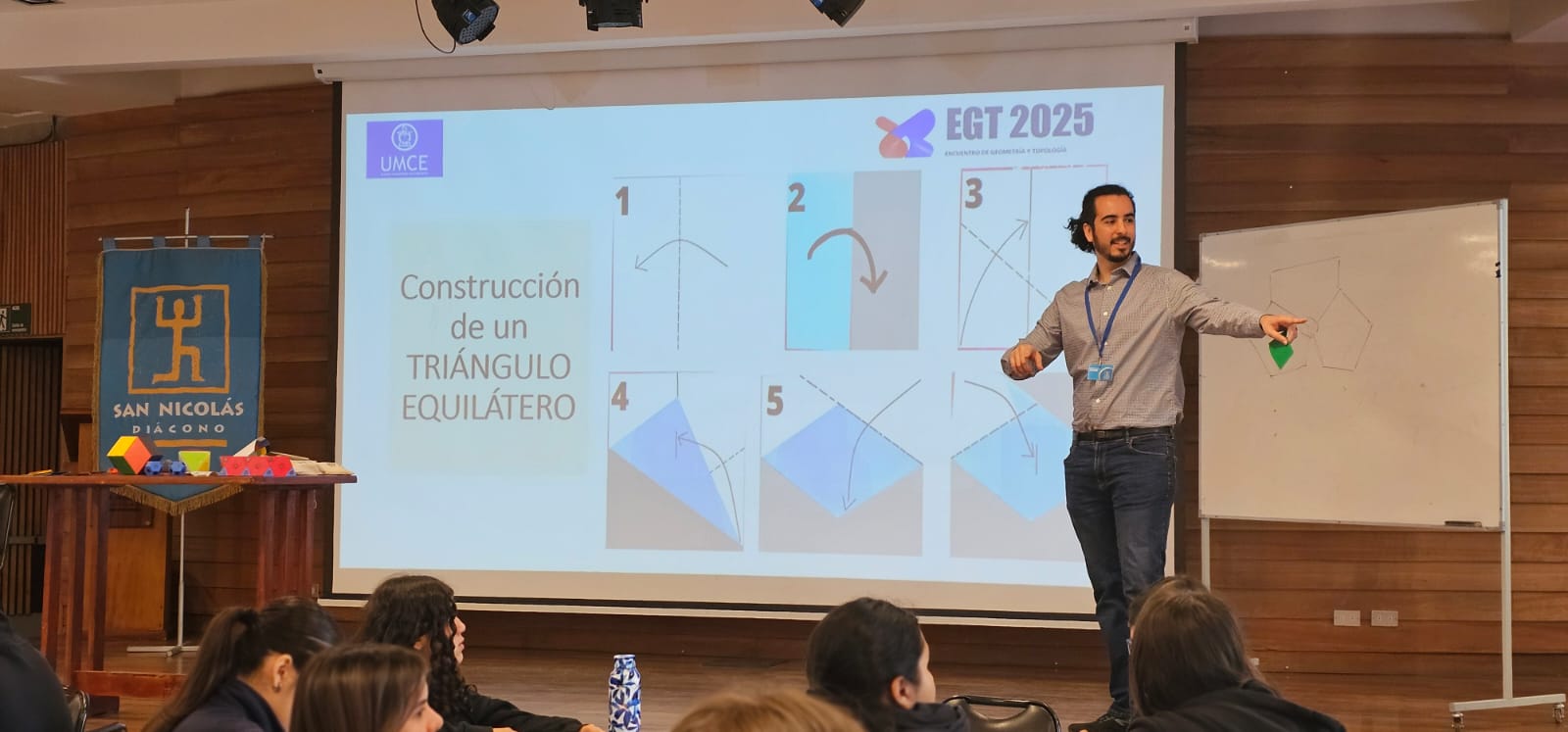 En el marco de la Semana de la Matemática organizada por el Colegio San Nicolás Diácono de Colina, la Dra. Isabel Berna, académica del Departamento de Matemática de la UMCE, participó junto a sus profesores en formación de Pedagogía en Matemática, Diego Cantillana y Krishna Menares, en una jornada marcada por la creatividad, la exploración geométrica y la vinculación con el medio escolar.