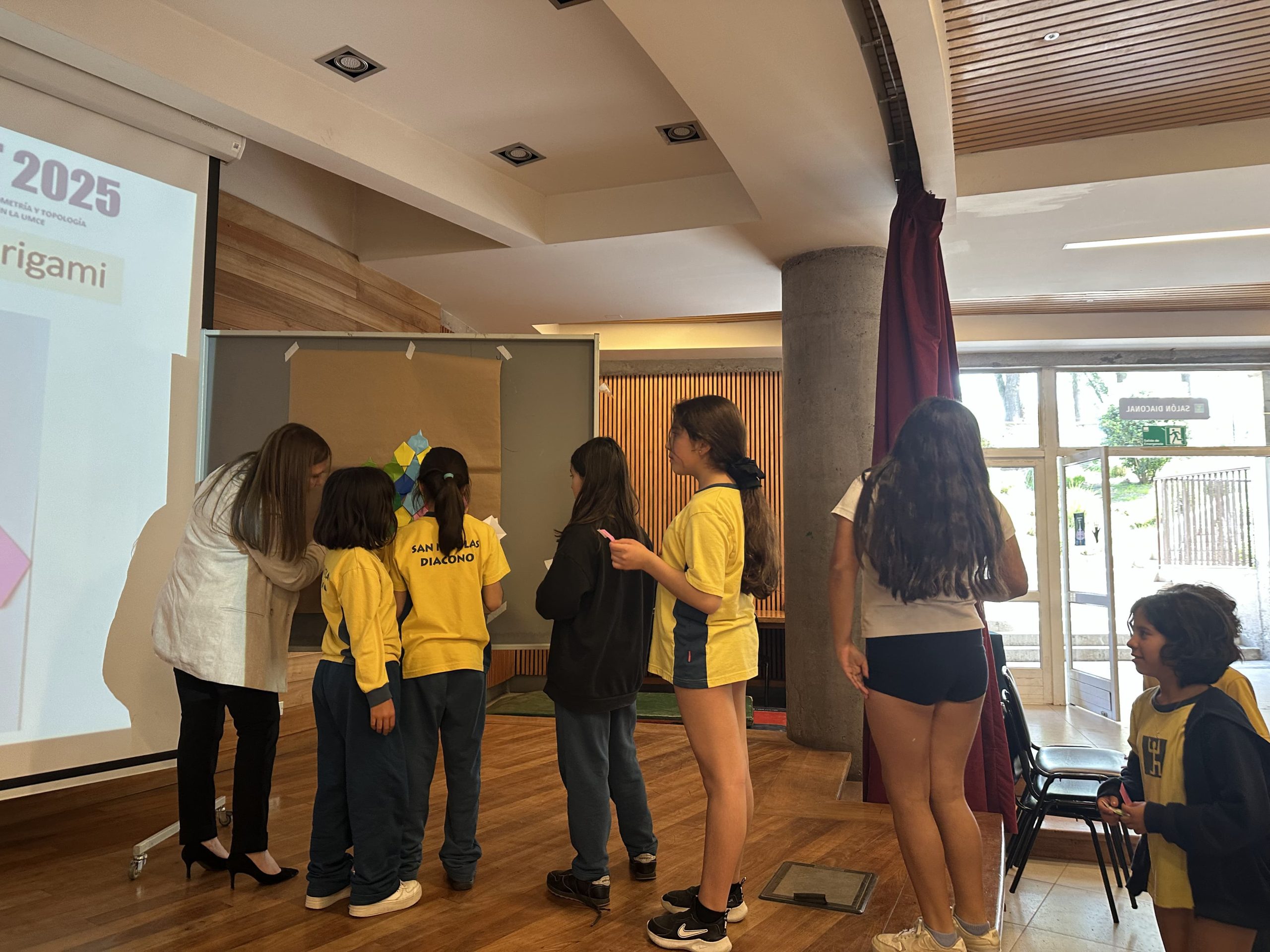 Durante la jornada, se desarrollaron dos talleres, el primero titulado: “La Rosa de 8 Puntas: Geometría y Arte en Origami”, dirigido a estudiantes de 4º básico, donde la experiencia permitió a las y los estudiantes descubrir la histórica estrella de ocho puntas, figura presente en el arte islámico medieval, especialmente en el Palacio de la Alhambra. Isabel Berna explica que, a través de pliegues sencillos, cada participante elaboró una rosa geométrica, contribuyendo a un mural colectivo donde matemática, arte e historia se entrelazaron de manera significativa”.