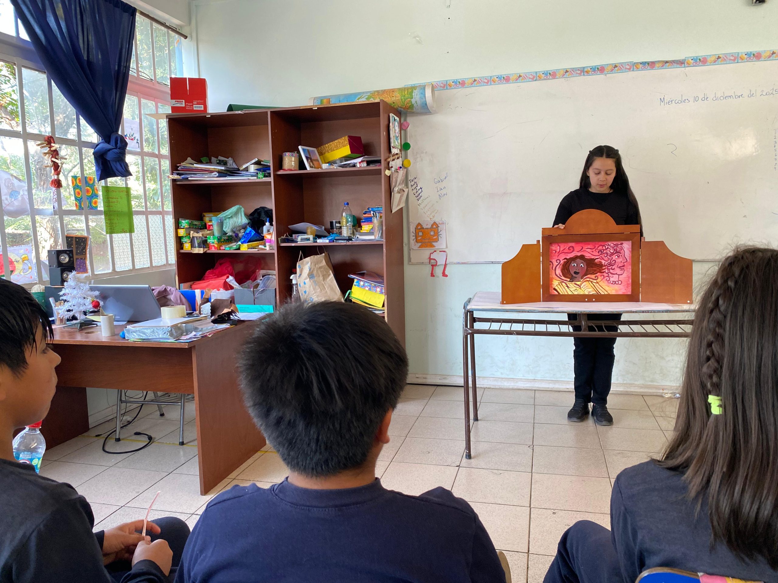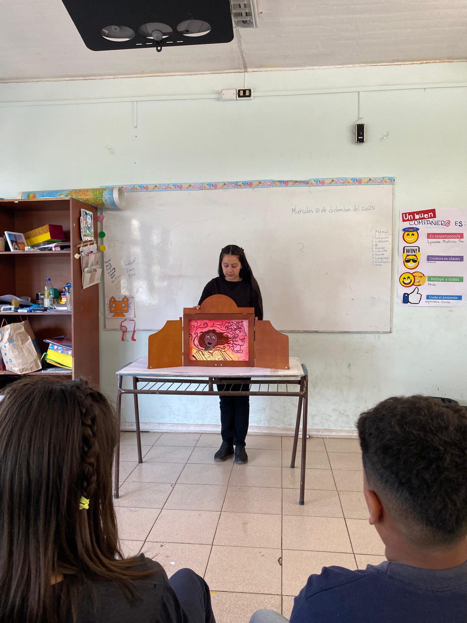 Una de estas experiencias se realizó en el Liceo A5 – UMCE, donde estudiantes de cuarto básico participaron en una lectura de kamishibai —tradicional técnica japonesa de narración conocida como “teatro de papel”—, seguida de una visita mediada a la sala patrimonial del establecimiento.