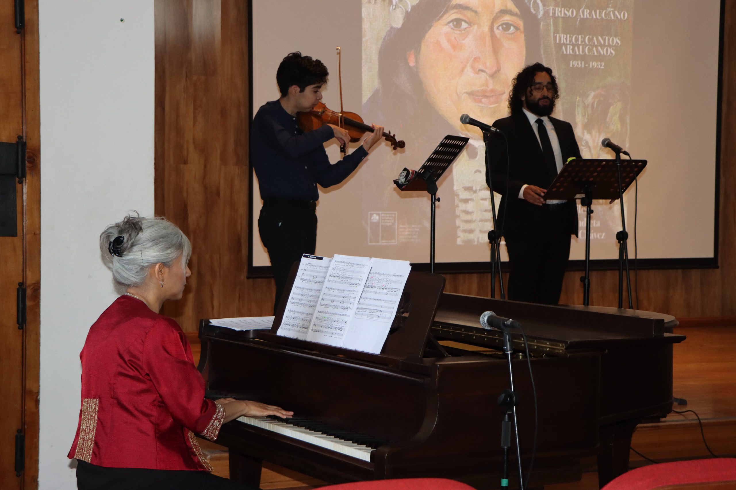 La actividad incluyó además interpretaciones en vivo de las y los músicos Nataly García (soprano), Diego Álvarez (barítono), Miguel Herrera (violín) y Elizabeth Mendieta (piano), quienes dieron nueva vida a este repertorio histórico, acercando al público a la riqueza sonora de los cantos mapuche registrados por Isamitt y recreados a partir de sus manuscritos originales.