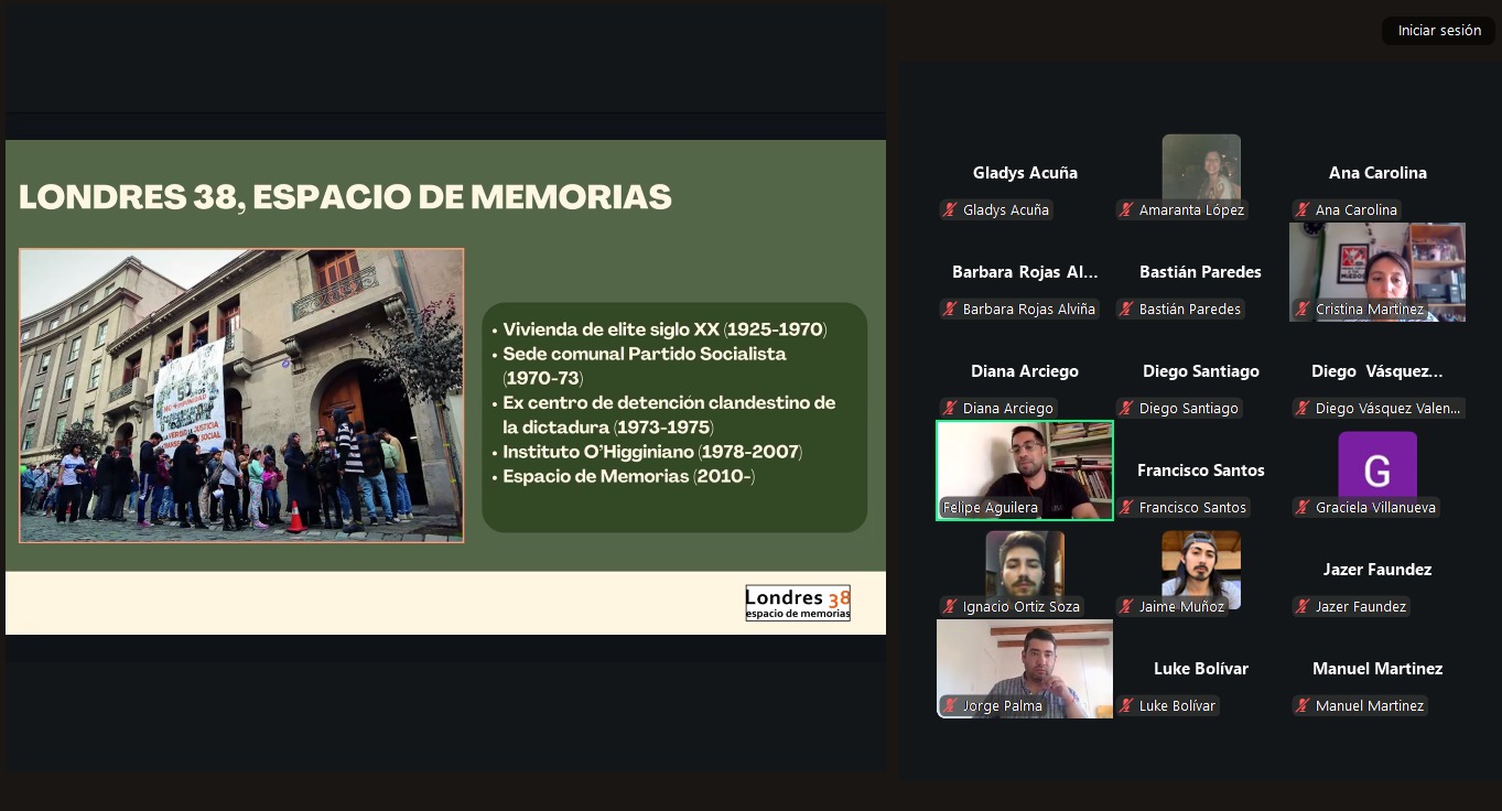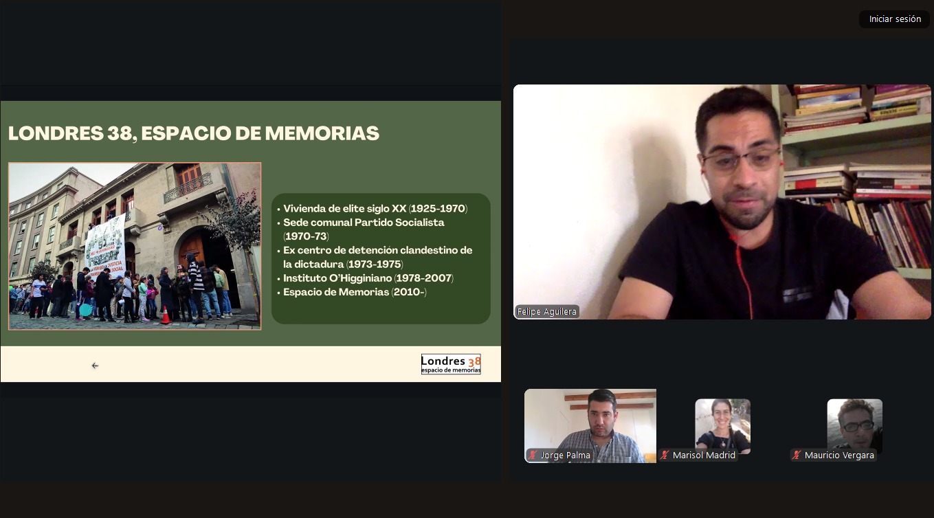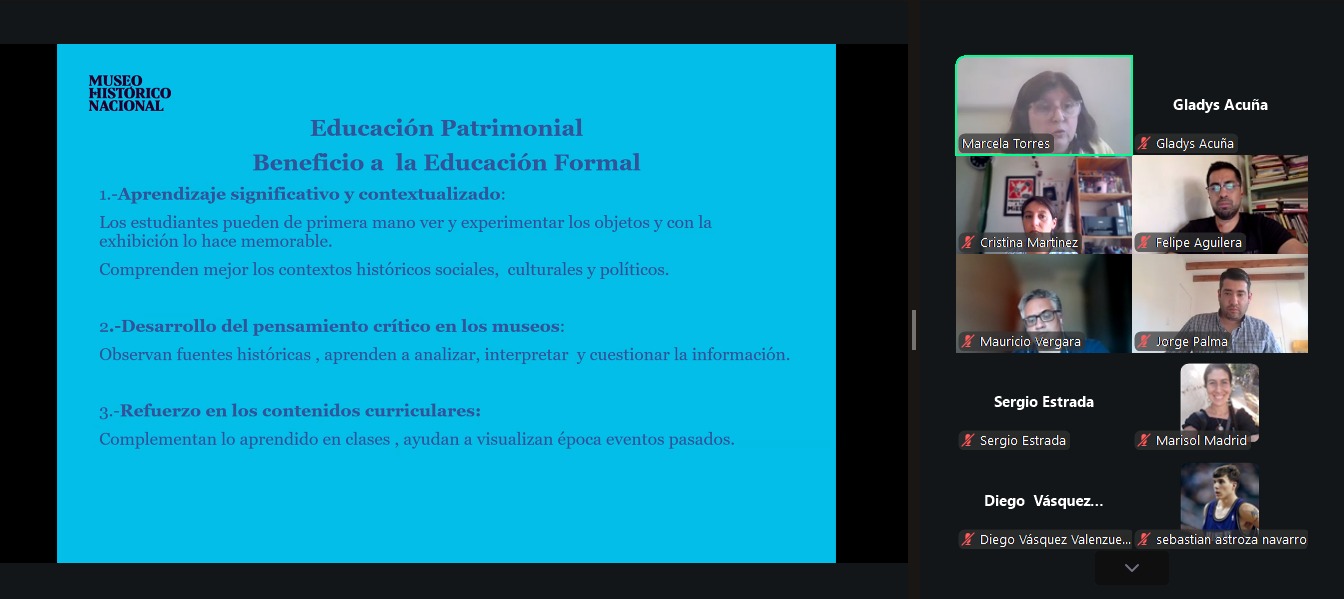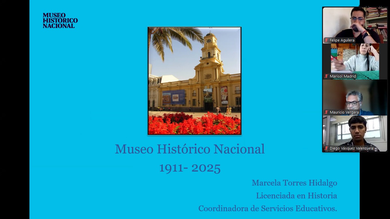 En el encuentro, realizado de manera on line, participaron Marcela Torres y Felipe Aguilera, docentes guías de prácticas UMCE y representantes de los equipos educativos del Museo Histórico Nacional y Londres 38, respectivamente. Desde sus experiencias, compartieron los desafíos de enseñar historia, memoria y ciudadanía en contextos que invitan a aprender desde la experiencia y el diálogo con el territorio.