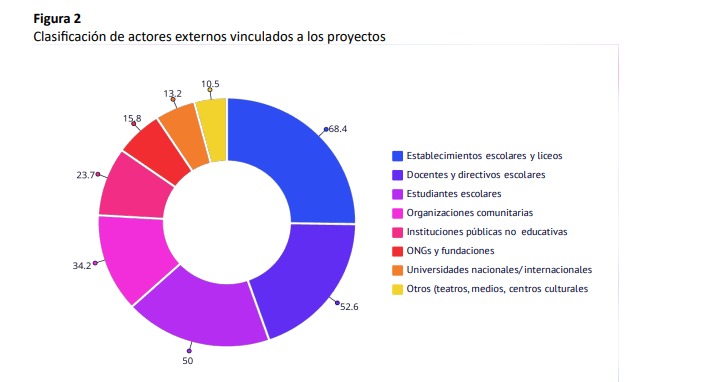 Entre los aportes más significativos reportados por los equipos, destacaron la articulación con la formación inicial docente (76,5 % de los proyectos de VcM), la formación práctica en contextos reales (70,6 %) y el trabajo directo con trayectos curriculares (58,8 %). Asimismo, varios proyectos comenzaron a incursionar en la investigación aplicada, la creación artística y la colaboración con redes académicas nacionales e internacionales.