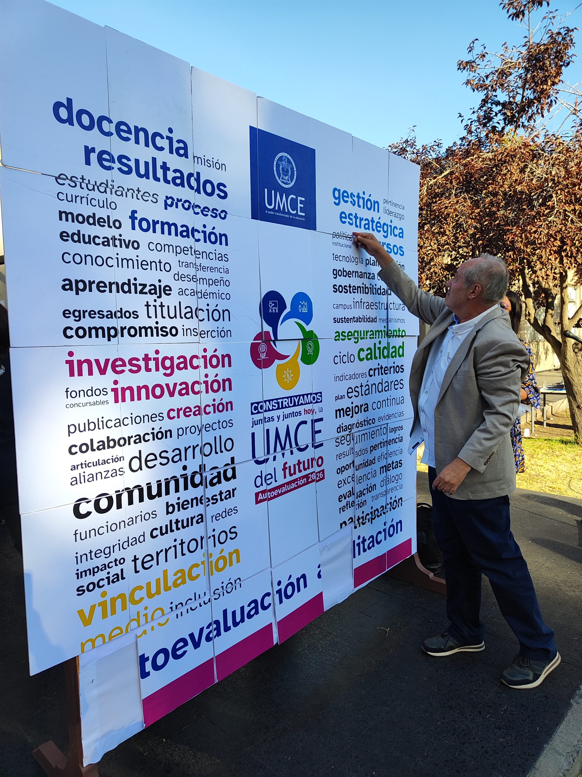 Para finalizar la ceremonia, se invitó a las y los presentes a participar activamente en el armado de un puzle con palabras clave asociadas a los procesos de Autoevaluación y Acreditación. Esta actividad simbolizó la construcción colectiva de la UMCE que se proyecta a futuro, recalcando el valor del trabajo colaborativo y el aporte necesario de cada integrante de la comunidad educativa.
