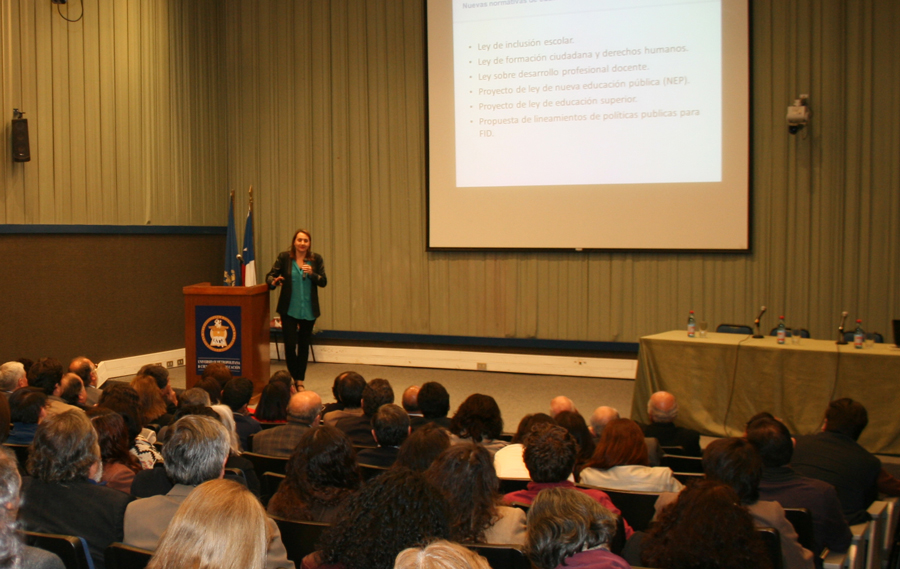 A su vez, la Clase Magistral estuvo a cargo de la jefa del Departamento de Financiamiento Institucional de la División de Educación Superior del MINEDUC, Fernanda Kri, quien plateó algunos desafíos e incitó a la reflexión en su presentación “Nuevas Normativas de Educación y Desafíos para la Formación Inicial Docente”.