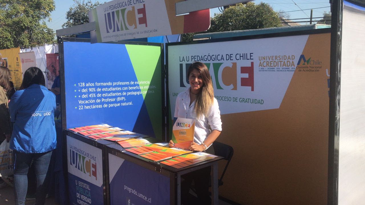 Entre los grandes eventos donde ha participado el stand de la UMCE, destacan las ferias de Elige Educar, Feria de Postulaciones (20.000 asistentes), Feria SIAD Rancagua y Santiago (12.000 asistentes) y EXPOFES Los Andes, a las que asisten gran cantidad de profesores, estudiantes y apoderados. En ellas se realizan charlas vocacionales, de contingencia en educación y se entrega información de carreras y programas.De esta forma, durante 2017, se visitaron 200 colegios y 11 preuniversitarios. El equipo a cargo de esta labor está formado por expositores/captadores a cargo de la Coordinación de Web y Marketing Institucional de la UMCE, quienes en los stands de la universidad entregan información de las carreras de pregrado y postgrado, junto con el legado histórico de nuestra insitución, a estudiantes y profesores.”Se visitó gran parte de la Región Metropolitana y se participó en Ferias de la Región de Valparaíso (Cordillera) y la Región de O’Higgins en 2 oportunidades, a través de eventos masivos, donde participan más de 3000 estudiantes en cada cada uno”, detalla Rodrigo Olivares, coordinador de Web y Marketing Institucional.