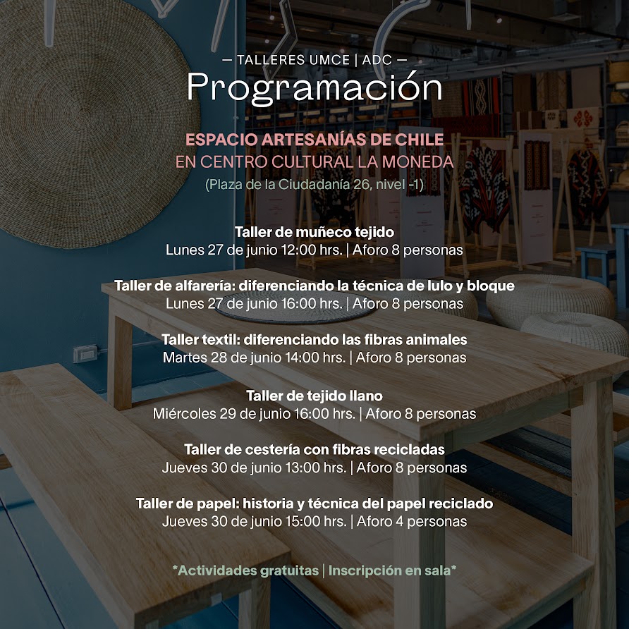 Tras realizar su pasantía en Artesanías de Chile, seis docentes en formación de la carrera de Licenciatura en Educación y Pedagogía en Artes Visuales de la UMCE culminarán su proceso con propuestas de talleres únicos entre los que se incluyen Taller de muñeco tejido, Taller de alfarería: diferenciando la técnica de lulo y bloque, Taller textil: diferenciando las fibras animales, Taller de tejido llano, Taller de cestería con fibras recicladas, y Taller de papel: historia y técnica del papel reciclado.