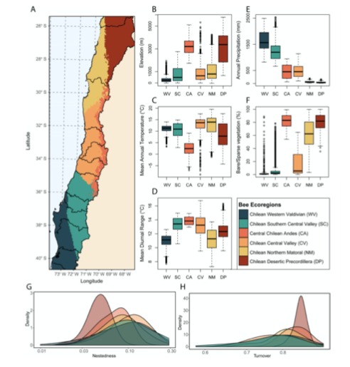 “Diversidad de abejas chilenas: patrones contrastantes de especies y recambio filogenético a lo largo de un gradiente ecológico a gran escala” (“Chilean bee diversity: Contrasting patterns of species and phylogenetic turnover along a large-scale ecological gradient”) es el nombre del artículo recientemente publicado en la revista de acceso abierto “Ecosphere” sobre biodiversidad de especies de abejas nativas de Chile, en el cual participaron el investigador y académico del Instituto de Entomología UMCE Cristian Villagra; el profesor Alejandro Vera Sánchez, de Departamento de Biología UMCE; la egresada del Magíster en Ciencias con mención en Entomología UMCE Patricia Henriquez-Piskulich; y la egresada de biología ambiental Valentina Herrera, junto con un grupo de investigadores/as de la Universé Libre de Bruselas (Bélgica); Naturalis Biodiversity Center, Leiden (Países bajos); y University of Singapore (Singapur).