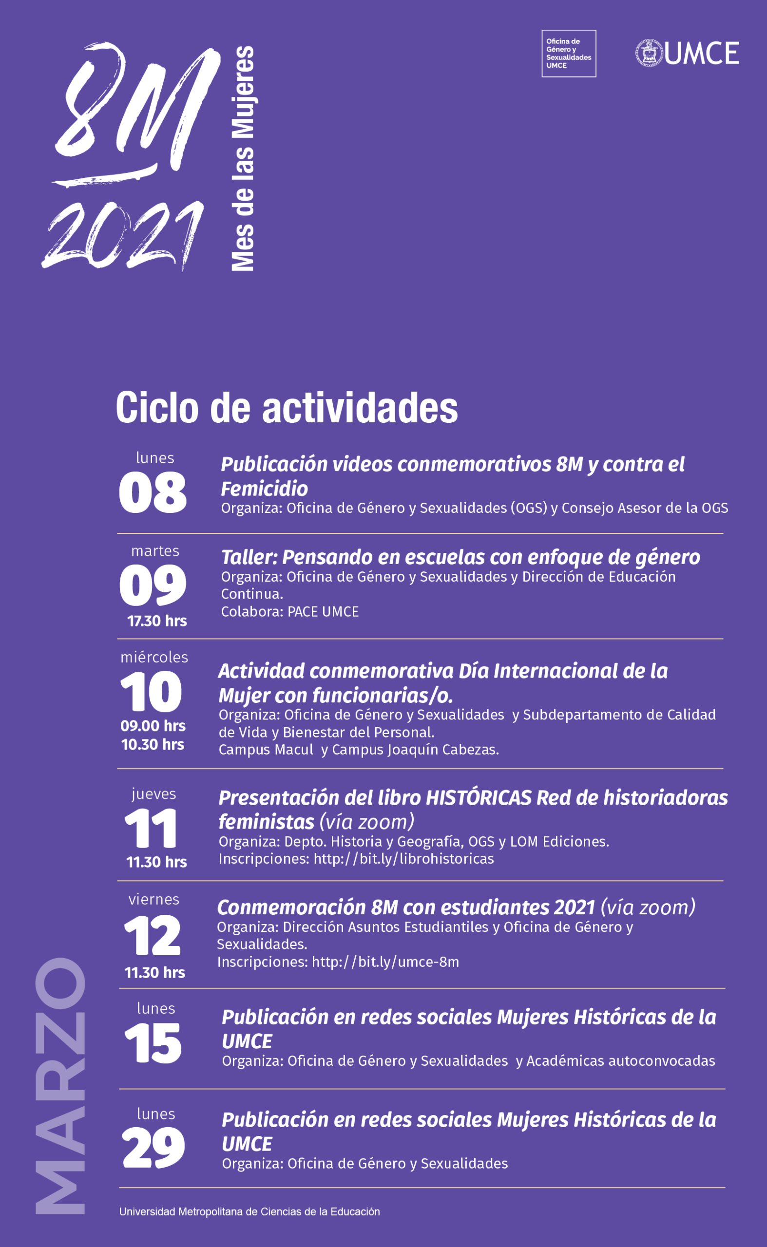 Una serie de actividades programó la UMCE para todo el mes de marzo, conmemorando la lucha de la mujer por su participación dentro de la sociedad y su desarrollo igualitario en el trabajo, en la cultura, en la educación y para erradicar la violencia contra la mujer en todas sus manifestaciones.