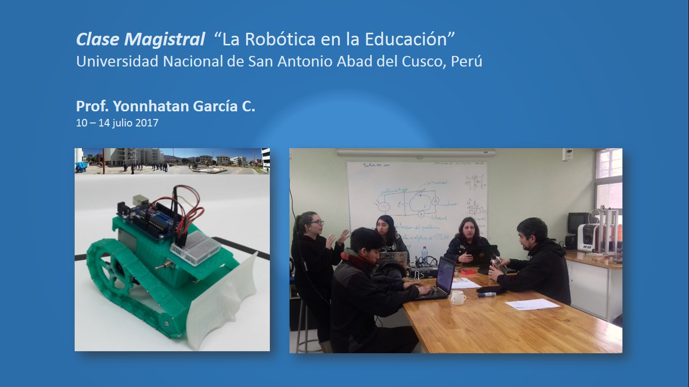 El Prof. Yonnhatan García fue invitado a dictar una Charla Magistral sobre “La Robótica en la Educación” en la Universidad Nacional de San Antonio Abad del Cusco. Con motivo de la conmemoración del LXXVIII aniversario de la Facultad de Educación y Ciencias de la Comunicación de esta Universidad, se realizó el evento denominado “Tecnologías Nuevas en la Educación”, en dicho evento el Prof. García presentó entre otros el primer robot construido 100% en el Laboratorio de Robótica del Departamento de Física, UMCE. Pdf