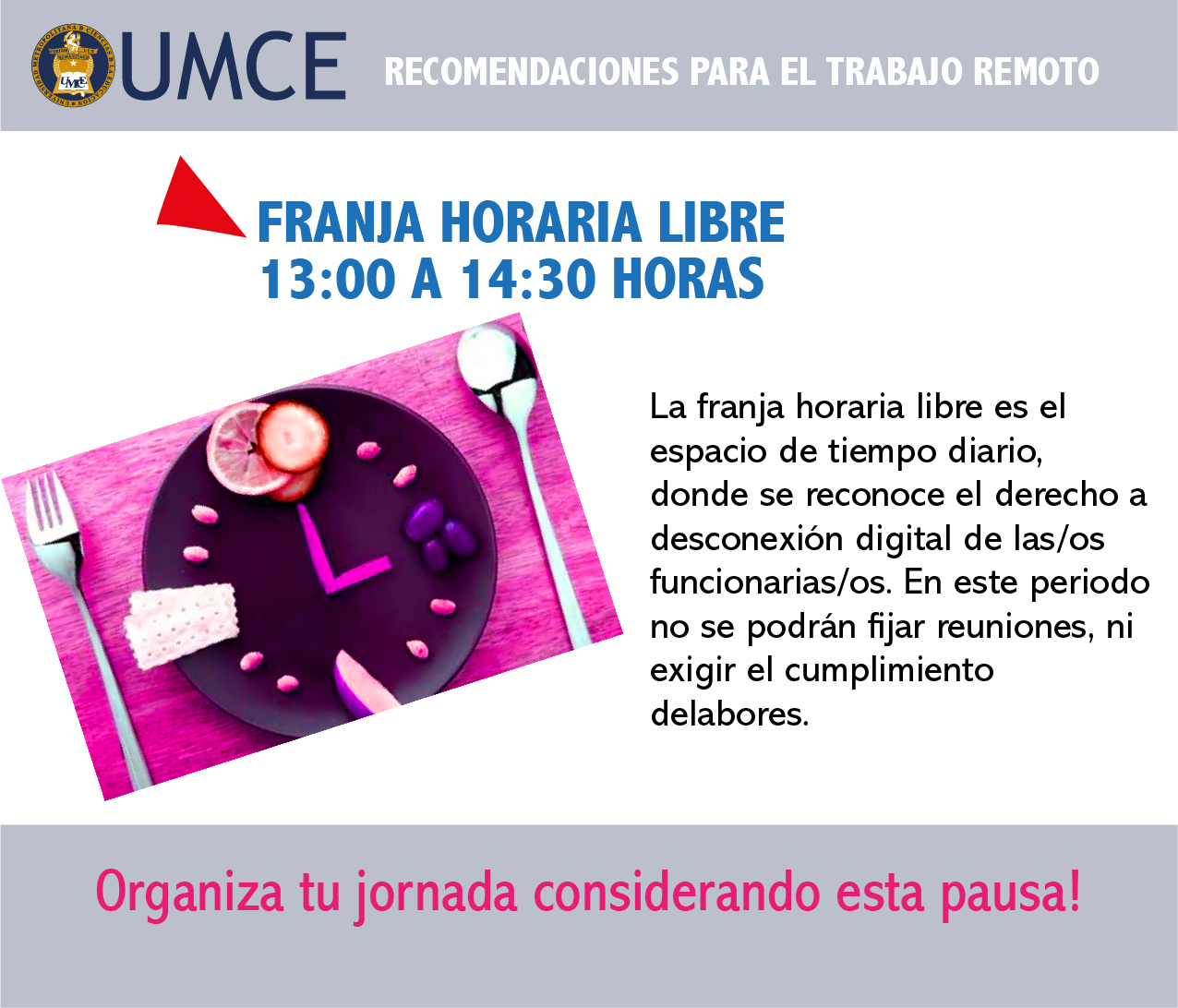 Dentro las iniciativas reguladas, se estableció una “franja horaria libre”, que regirá entre 13:00 a 14.30 horas, donde no se podrán fijar reuniones ni exigir el cumplimiento de labores a los/as funcionarios/as, reconociendo expresamente, su derecho a desconexión digital.