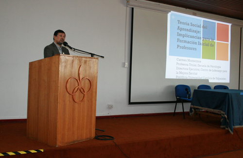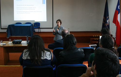 Carmen Montecinos presentó algunos resultados de sus investigaciones y experiencias sobre los efectos de la Teoría Social del Aprendizaje para la formación inicial docente que comprenden el conocimiento y el aprendizaje docente como fenómenos sociales y culturales, situados en los contextos en los cuales se implementan actividades auténticas del desempeño profesional. Sus estudios confirman la importancia de la formación práctica en el desarrollo de las capacidades  docentes, así como la experiencia fundamental que poseen los establecimientos escolares para contribuir sustantivamente al proceso de formación de los docentes.