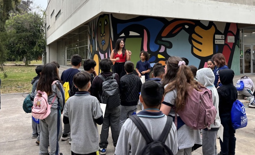 El recorrido incluyó el mural del artista y Premio Nacional de Artes Plásticas 2025, Alejandro “Mono” González, ubicado en la Biblioteca Central, así como obras de las artistas Mireya Guillén y Victoria Salas, emplazadas en el Departamento de Matemáticas. Durante la visita, las y los estudiantes realizaron ejercicios de exploración sensorial, recogiendo texturas y relieves de los murales y de distintos espacios del campus mediante la técnica de frottage.